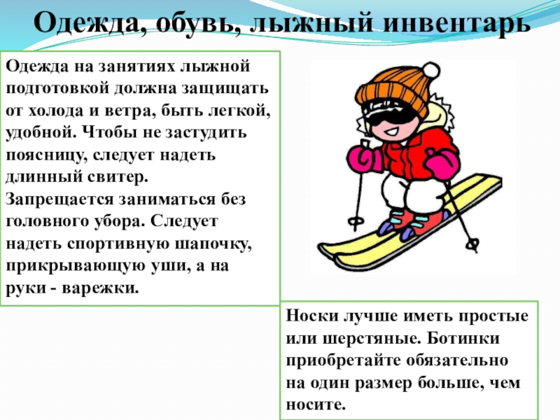 Носки лучше иметь простые или шерстяные. Ботинки приобретайте обязательно на один размер больше, чем носите.