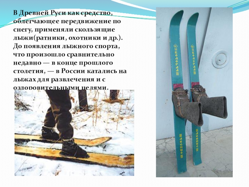 Первоначально лыжи использовались по прямому назначению — для передвижения по глубокому снегу в лесу во время охоты, военных действий в зимних условиях и т. п.. Это и определяло их тогдашние пропорции — они были короткие (150 см в среднем) и широкие (15-20 см), удобные скорее для переступания, чем для скольжения