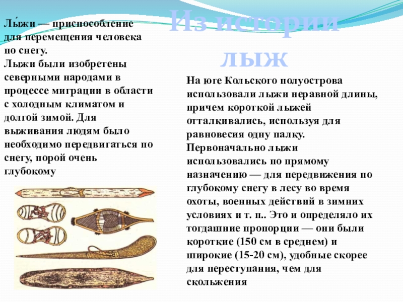 На юге Кольского полуострова использовали лыжи неравной длины, причем короткой лыжей отталкивались, используя для равновесия одну палку.