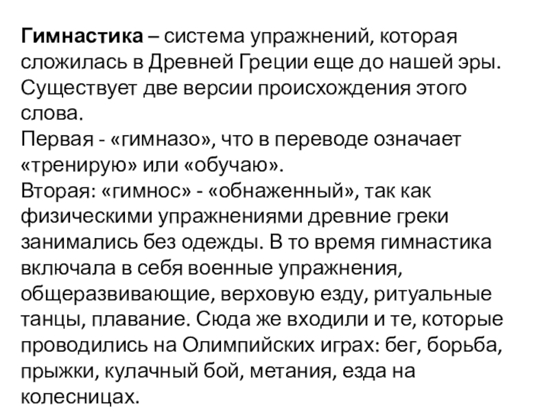 Гимнастика – система упражнений, которая сложилась в Древней Греции еще до нашей эры. Существует две версии происхождения этого слова. Первая - «гимназо», что в переводе означает «тренирую» или «обучаю». Вторая: «гимнос» - «обнаженный», так как физическими