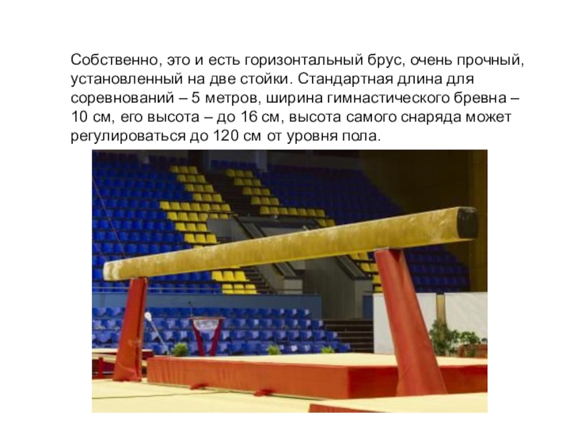 стойки. Стандартная длина для соревнований – 5 метров, ширина гимнастического бревна – 10 см, его высота – до 16 см, высота самого снаряда может регулироваться до 120 см от уровня пола.
