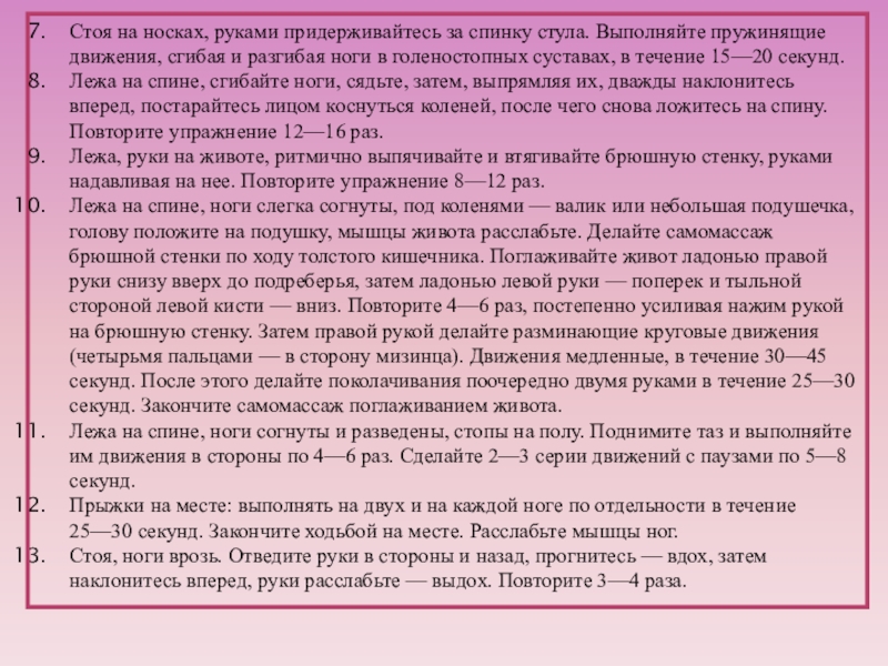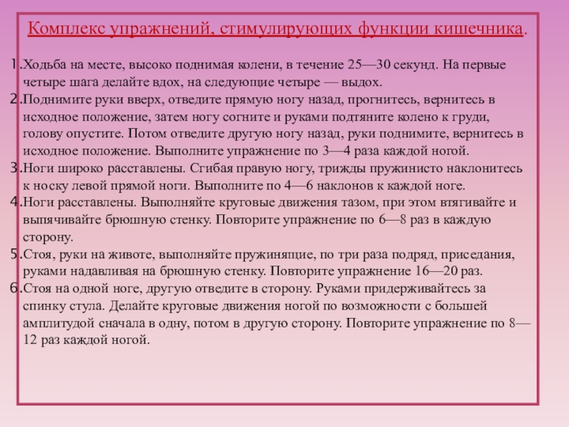 Слайд 19Комплекс упражнений, стимулирующих функции кишечника.