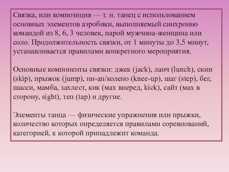 Слайд 3Связка, или композиция — т. н. танец с использованием основных элементов аэробики, выполняемый