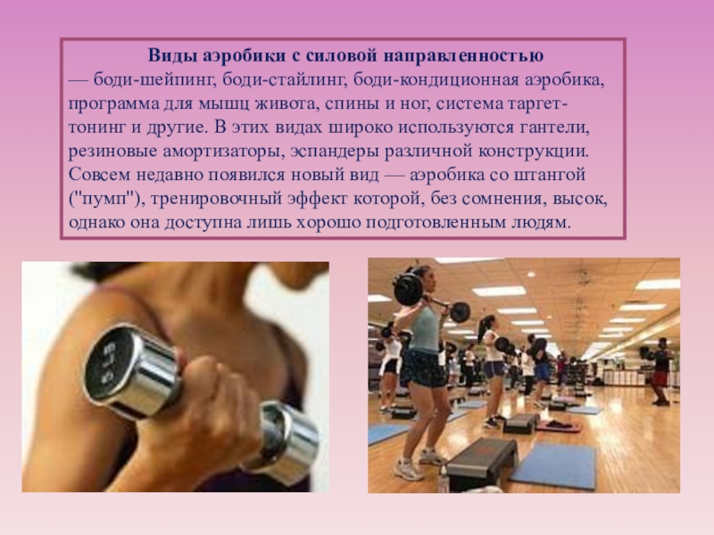 программа для мышц живота, спины и ног, система таргет-тонинг и другие. В этих видах широко используются гантели, резиновые амортизаторы, эспандеры различной конструкции. Совсем недавно появился новый вид — аэробика со штангой ("пумп"), тренировочный эффект которой, без сомнения, высок, однако она доступна лишь хорошо подготовленным людям.