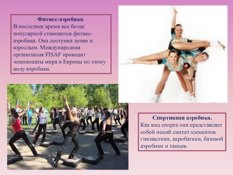 детям и взрослым. Международная организация FISAF проводит чемпионаты мира и Европы по этому виду аэробики.