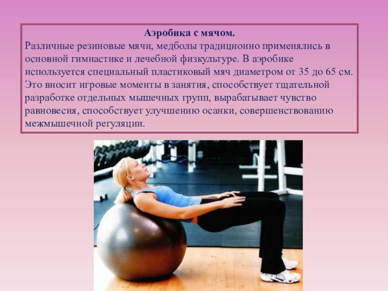 гимнастике и лечебной физкультуре. В аэробике используется специальный пластиковый мяч диаметром от 35 до 65 см. Это вносит игровые моменты в занятия, способствует тщательной разработке отдельных мышечных групп, вырабатывает чувство равновесия, способствует улучшению осанки, совершенствованию межмышечной регуляции.