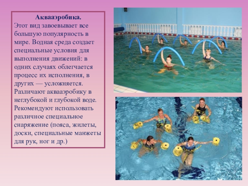 создает специальные условия для выполнения движений: в одних случаях облегчается процесс их исполнения, в других — усложняется. Различают аквааэробику в неглубокой и глубокой воде. Рекомендуют использовать различное специальное снаряжение (пояса, жилеты, доски, специальные манжеты для рук, ног и др.)