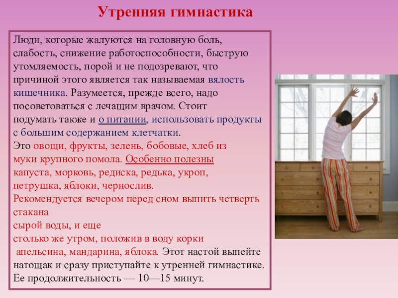 апельсина, мандарина, яблока. Этот настой выпейте натощак и сразу приступайте к утренней гимнастике. Ее продолжительность — 10—15 минут.