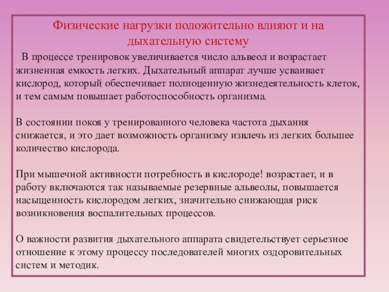 Слайд 16Физические нагрузки положительно влияют и на дыхательную систему