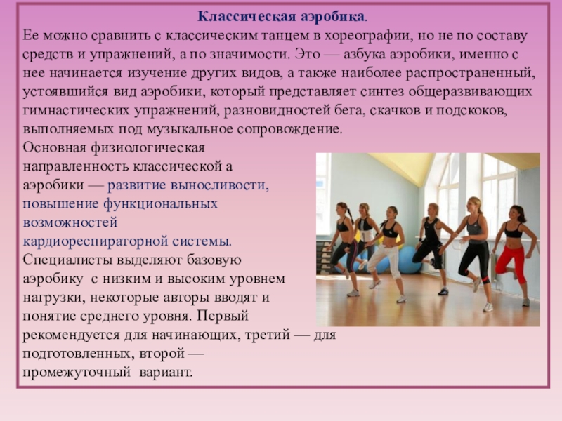 не по составу средств и упражнений, а по значимости. Это — азбука аэробики, именно с нее начинается изучение других видов, а также наиболее распространенный, устоявшийся вид аэробики, который представляет синтез общеразвивающих гимнастических упражнений, разновидностей бега, скачков и подскоков, выполняемых под музыкальное сопровождение.