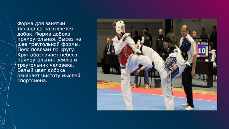 Слайд 6Форма для занятий тхэквондо называется добок. Форма добока прямоугольная. Вырез на