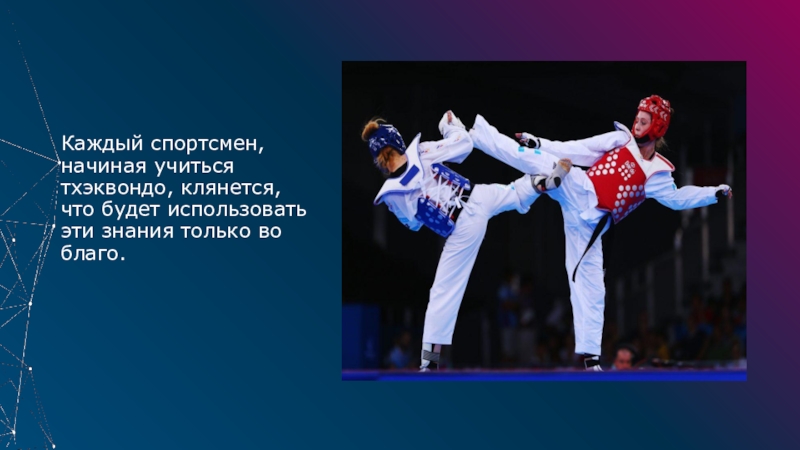Слайд 9Каждый спортсмен, начиная учиться тхэквондо, клянется, что будет использовать эти знания