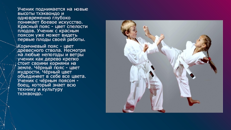 Слайд 8Ученик поднимается на новые высоты тхэквондо и одновременно глубоко понимает боевое