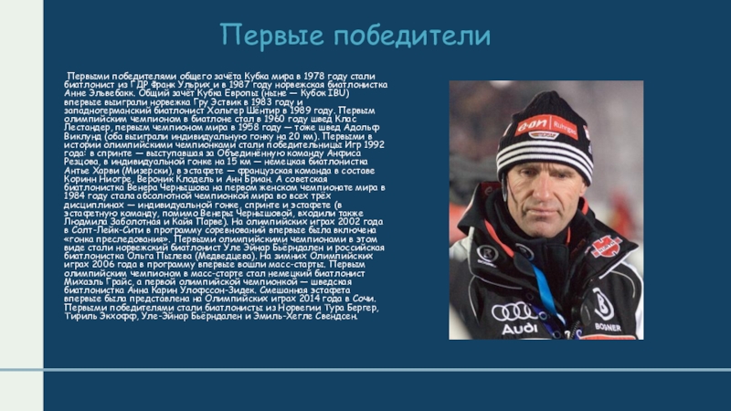стали биатлонист из ГДР Франк Ульрих и в 1987 году норвежская биатлонистка Анне Эльвебакк. Общий зачёт Кубка Европы (ныне — Кубок IBU) впервые выиграли норвежка Гру Эствик в 1983 году и западногерманский биатлонист Хольгер Шёнтир в 1989 году. Первым олимпийским чемпионом в биатлоне стал в 1960 году швед Клас Лестандер, первым чемпионом мира в 1958 году — тоже швед Адольф Виклунд (оба выиграли индивидуальную гонку на 20 км). Первыми в истории олимпийскими чемпионками стали победительницы Игр 1992 года: в спринте — выступавшая за Объединённую команду Анфиса Резцова, в индивидуальной гонке на 15 км — немецкая биатлонистка Антье Харви (Мизерски), в эстафете — французская команда в составе Коринн Ниогре, Вероник Клодель и Анн Бриан. А советская биатлонистка Венера Чернышова на первом женском чемпионате мира в 1984 году стала абсолютной чемпионкой мира во всех трёх дисциплинах — индивидуальной гонке, спринте и эстафете (в эстафетную команду, помимо Венеры Чернышовой, входили также Людмила Заболотная и Кайя Парве). На олимпийских играх 2002 года в Солт-Лейк-Сити в программу соревнований впервые была включена «гонка преследования». Первыми олимпийскими чемпионами в этом виде стали норвежский биатлонист Уле Эйнар Бьёрндален и российская биатлонистка Ольга Пылева (Медведцева). На зимних Олимпийских играх 2006 года в программу впервые вошли масс-старты. Первым олимпийским чемпионом в масс-старте стал немецкий биатлонист Михаэль Грайс, а первой олимпийской чемпионкой — шведская биатлонистка Анна Карин Улофссон-Зидек. Смешанная эстафета впервые была представлена на Олимпийских играх 2014 года в Сочи. Первыми победителями стали биатлонисты из Норвегии Тура Бергер, Тириль Экхофф, Уле-Эйнар Бьёрндален и Эмиль-Хегле Свендсен.