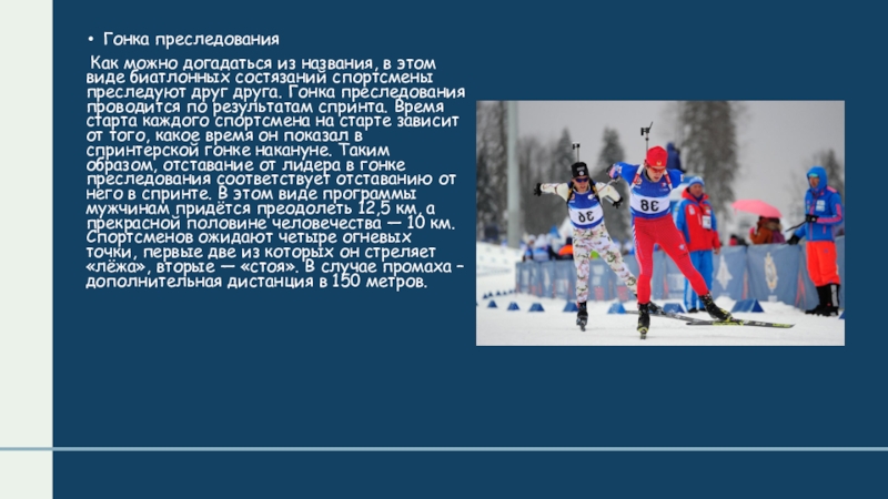 состязаний спортсмены преследуют друг друга. Гонка преследования проводится по результатам спринта. Время старта каждого спортсмена на старте зависит от того, какое время он показал в спринтерской гонке накануне. Таким образом, отставание от лидера в гонке преследования соответствует отставанию от него в спринте. В этом виде программы мужчинам придётся преодолеть 12,5 км, а прекрасной половине человечества — 10 км. Спортсменов ожидают четыре огневых точки, первые две из которых он стреляет «лёжа», вторые — «стоя». В случае промаха – дополнительная дистанция в 150 метров.