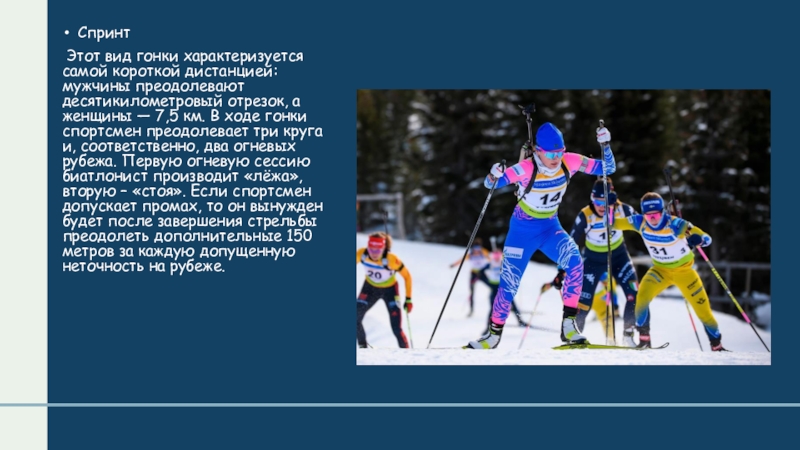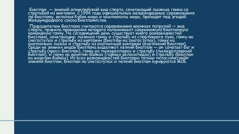 Слайд 2 Биатлон — зимний олимпийский вид спорта, сочетающий лыжные гонки со