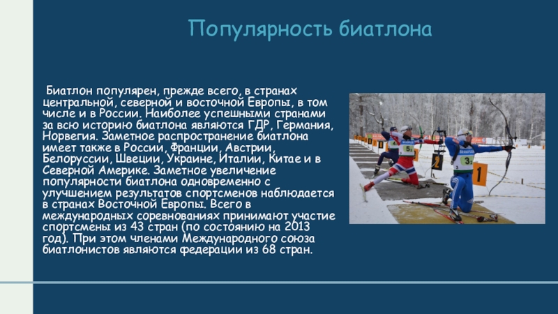 восточной Европы, в том числе и в России. Наиболее успешными странами за всю историю биатлона являются ГДР, Германия, Норвегия. Заметное распространение биатлона имеет также в России, Франции, Австрии, Белоруссии, Швеции, Украине, Италии, Китае и в Северной Америке. Заметное увеличение популярности биатлона одновременно с улучшением результатов спортсменов наблюдается в странах Восточной Европы. Всего в международных соревнованиях принимают участие спортсмены из 43 стран (по состоянию на 2013 год). При этом членами Международного союза биатлонистов являются федерации из 68 стран.