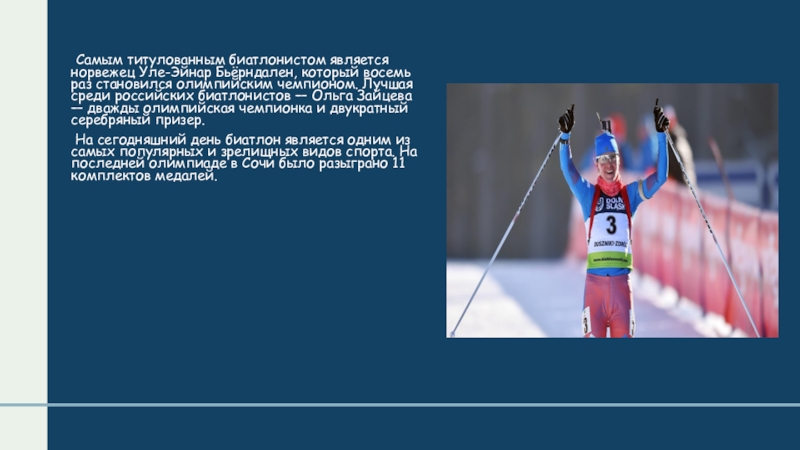 Слайд 12 Самым титулованным биатлонистом является норвежец Уле-Эйнар Бьёрндален, который восемь раз