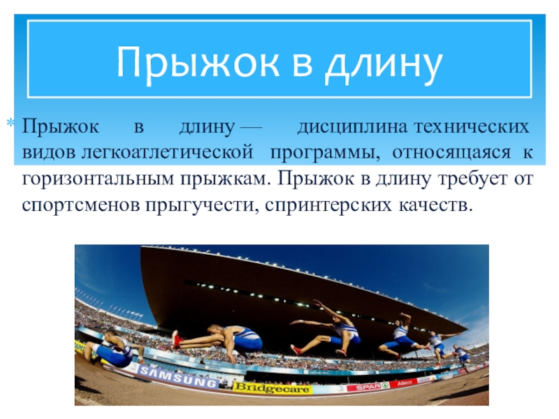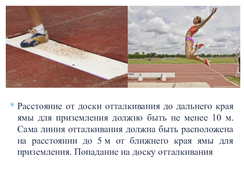 Задача атлета — достигнуть наибольшей горизонтальной длины прыжка с разбега.