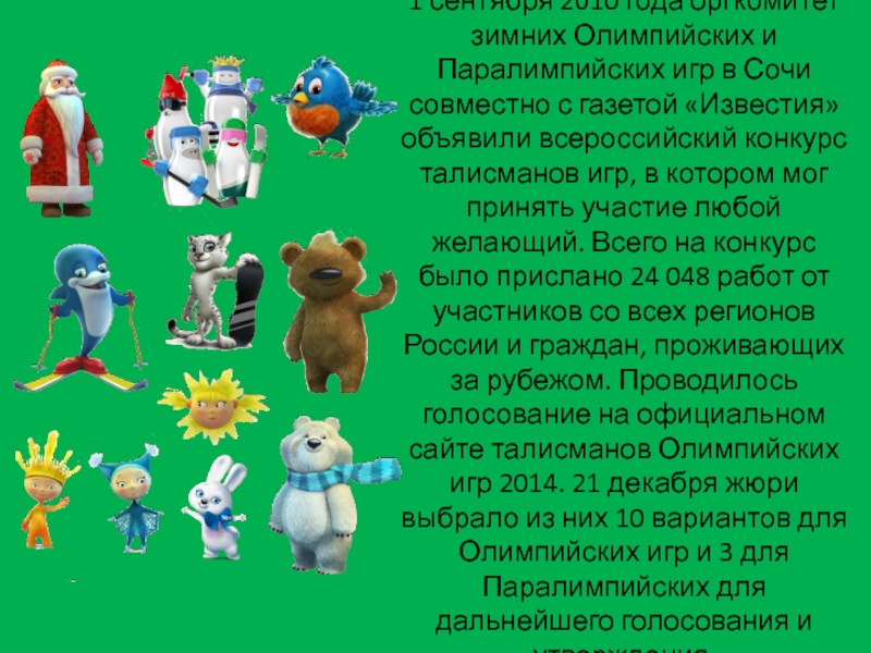 совместно с газетой «Известия» объявили всероссийский конкурс талисманов игр, в котором мог принять участие любой желающий. Всего на конкурс было прислано 24 048 работ от участников со всех регионов России и граждан, проживающих за рубежом. Проводилось голосование на официальном сайте талисманов Олимпийских игр 2014. 21 декабря жюри выбрало из них 10 вариантов для Олимпийских игр и 3 для Паралимпийских для дальнейшего голосования и утверждения.