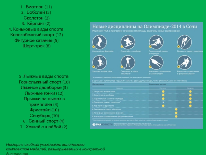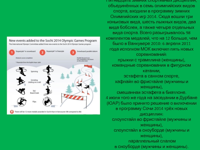 программу зимних Олимпийских игр 2014. Сюда вошли три коньковых вида, шесть лыжных видов, два вида бобслея, а также четыре отдельных вида спорта. Всего разыгрывалось 98 комплектов медалей, что на 12 больше, чем было в Ванкувере 2010: 6 апреля 2011 года исполком МОК включил пять новых соревнований: