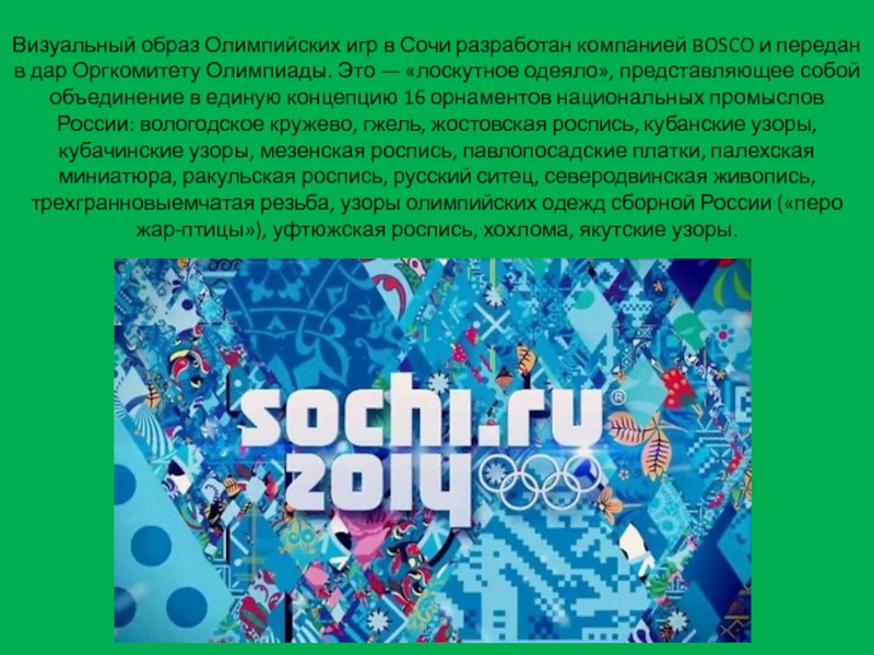 Слайд 14Визуальный образ Олимпийских игр в Сочи разработан компанией BOSCO и передан
