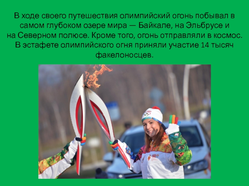 мира — Байкале, на Эльбрусе и на Северном полюсе. Кроме того, огонь отправляли в космос.