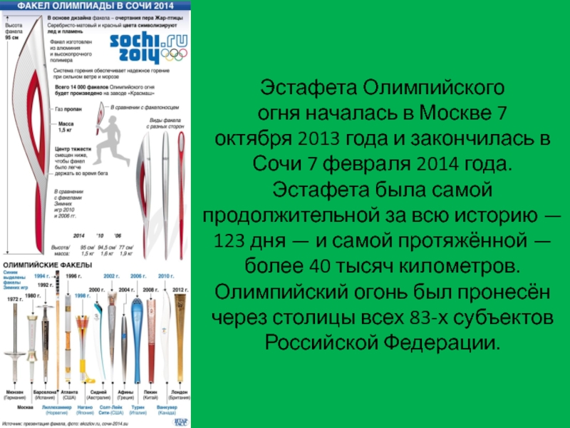 Слайд 16Эстафета Олимпийского огня началась в Москве 7 октября 2013 года и закончилась в Сочи 7 февраля 2014 года.