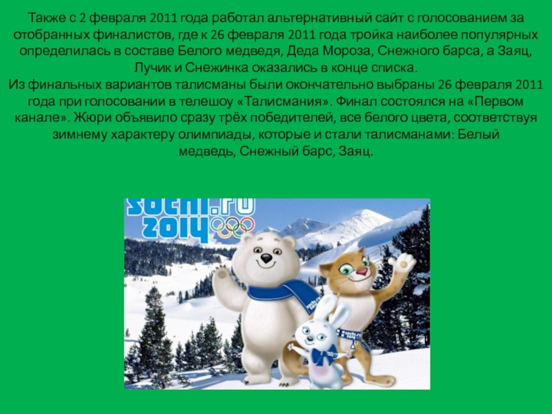 Из финальных вариантов талисманы были окончательно выбраны 26 февраля 2011 года при голосовании в телешоу «Талисмания». Финал состоялся на «Первом канале». Жюри объявило сразу трёх победителей, все белого цвета, соответствуя зимнему характеру олимпиады, которые и стали талисманами: Белый медведь, Снежный барс, Заяц.