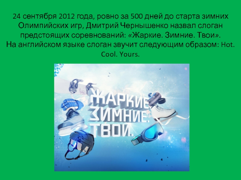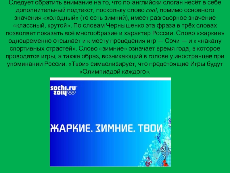 дополнительный подтекст, поскольку слово cool, помимо основного значения «холодный» (то есть зимний), имеет разговорное значение «классный, крутой». По словам Чернышенко эта фраза в трёх словах позволяет показать всё многообразие и характер России. Слово «жаркие» одновременно отсылает и к месту проведения игр — Сочи — и к «накалу спортивных страстей». Слово «зимние» означает время года, в которое проводятся игры, а также образ, возникающий в голове у иностранцев при упоминании России. «Твои» символизирует, что предстоящие Игры будут «Олимпиадой каждого».