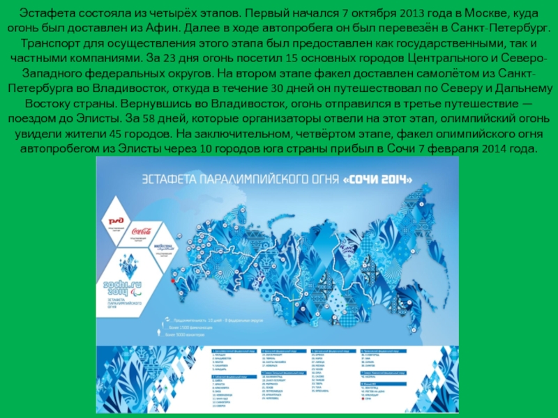 Слайд 17Эстафета состояла из четырёх этапов. Первый начался 7 октября 2013 года в Москве,