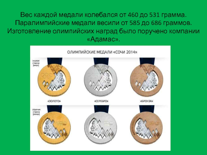 весили от 585 до 686 граммов. Изготовление олимпийских наград было поручено компании «Адамас».