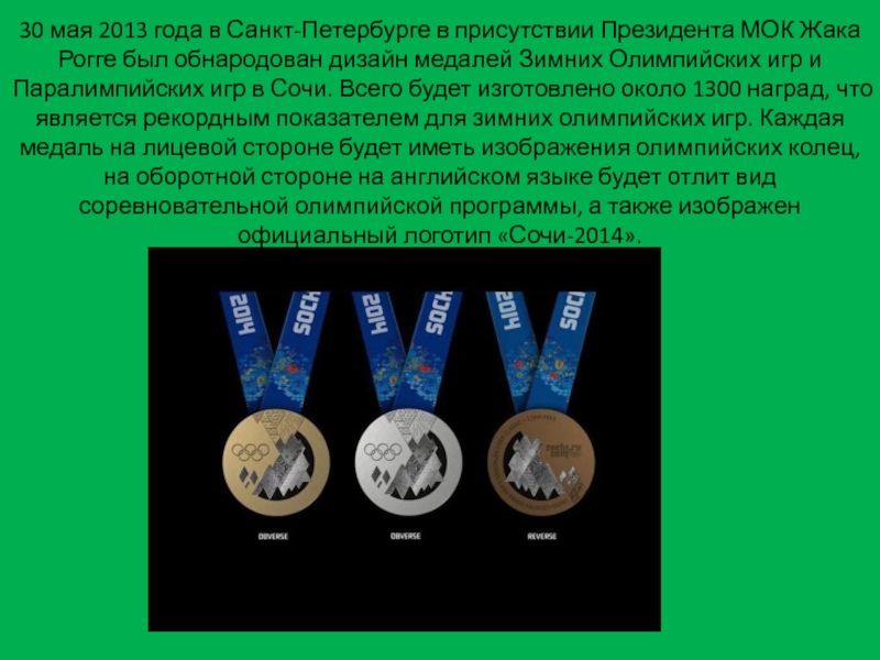Слайд 1930 мая 2013 года в Санкт-Петербурге в присутствии Президента МОК Жака Рогге был обнародован дизайн