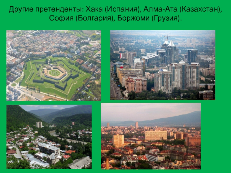 Слайд 5Другие претенденты: Хака (Испания), Алма-Ата (Казахстан), София (Болгария), Боржоми (Грузия).