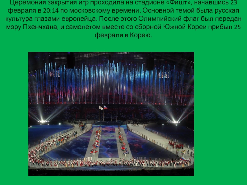 Слайд 28Церемония закрытия игр проходила на стадионе «Фишт», начавшись 23 февраля в