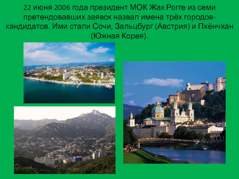 имена трёх городов-кандидатов. Ими стали Сочи, Зальцбург (Австрия) и Пхёнчхан (Южная Корея).