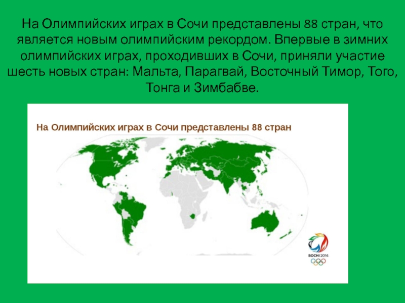 Слайд 25На Олимпийских играх в Сочи представлены 88 стран, что является новым