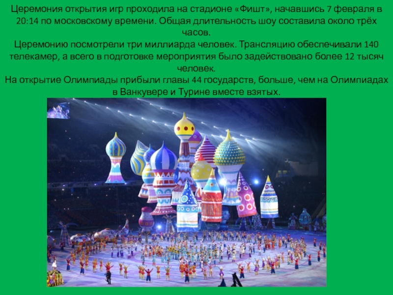 Слайд 22Церемония открытия игр проходила на стадионе «Фишт», начавшись 7 февраля в