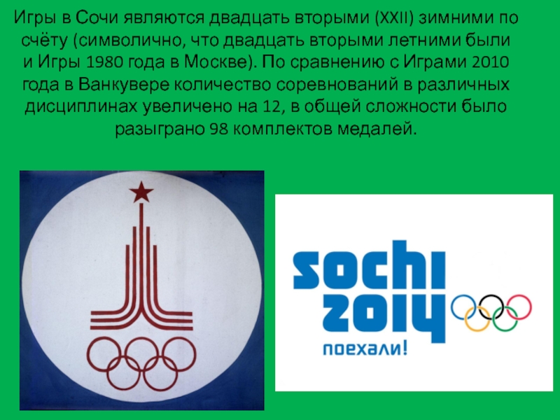 Слайд 3Игры в Сочи являются двадцать вторыми (XXII) зимними по счёту (символично,