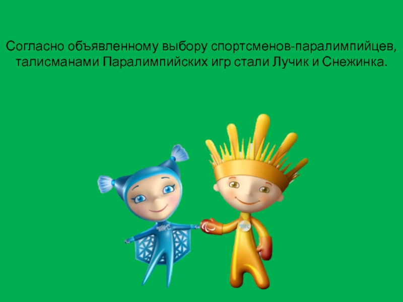 Слайд 11Согласно объявленному выбору спортсменов-паралимпийцев, талисманами Паралимпийских игр стали Лучик и Снежинка.