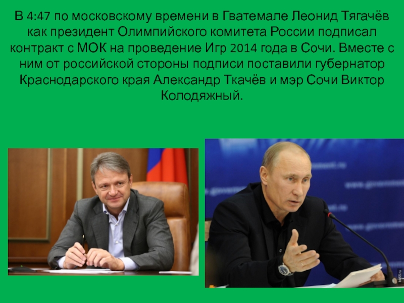 комитета России подписал контракт с МОК на проведение Игр 2014 года в Сочи. Вместе с ним от российской стороны подписи поставили губернатор Краснодарского края Александр Ткачёв и мэр Сочи Виктор Колодяжный.