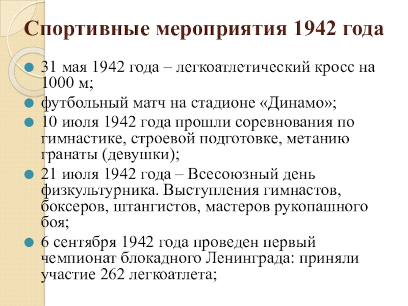 Спортивные мероприятия 1942 года31 мая 1942 года – легкоатлетический кросс на 1000 м;футбольный матч на стадионе «Динамо»;10