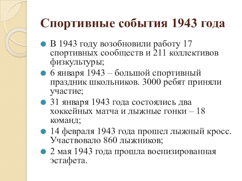Спортивные события 1943 годаВ 1943 году возобновили работу 17 спортивных сообществ и 211 коллективов физкультуры;6 января 1943