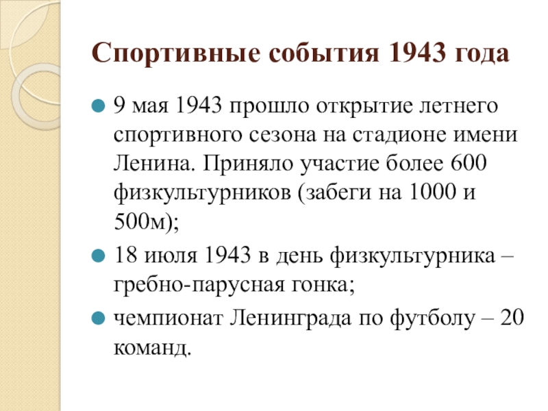 Спортивные события 1943 года9 мая 1943 прошло открытие летнего спортивного сезона на стадионе имени Ленина. Приняло участие