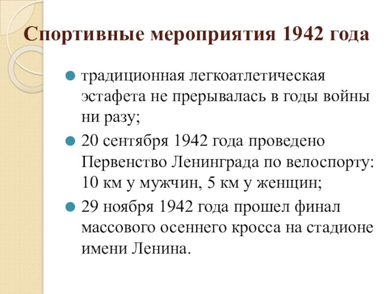 Спортивные мероприятия 1942 годатрадиционная легкоатлетическая эстафета не прерывалась в годы войны ни разу;20 сентября 1942 года проведено