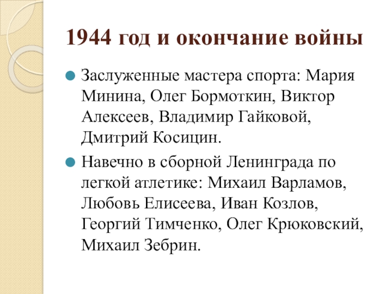 1944 год и окончание войныЗаслуженные мастера спорта: Мария Минина, Олег Бормоткин, Виктор Алексеев, Владимир Гайковой, Дмитрий Косицин.Навечно