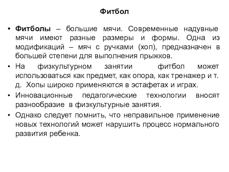 На физкультурном занятии фитбол может использоваться как предмет, как опора, как тренажер и т.д. Хопы широко применяются в эстафетах и играх.