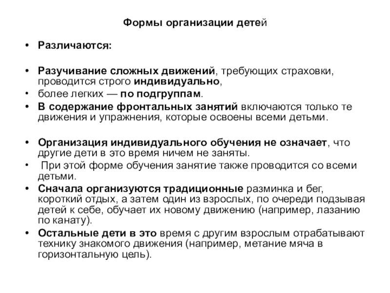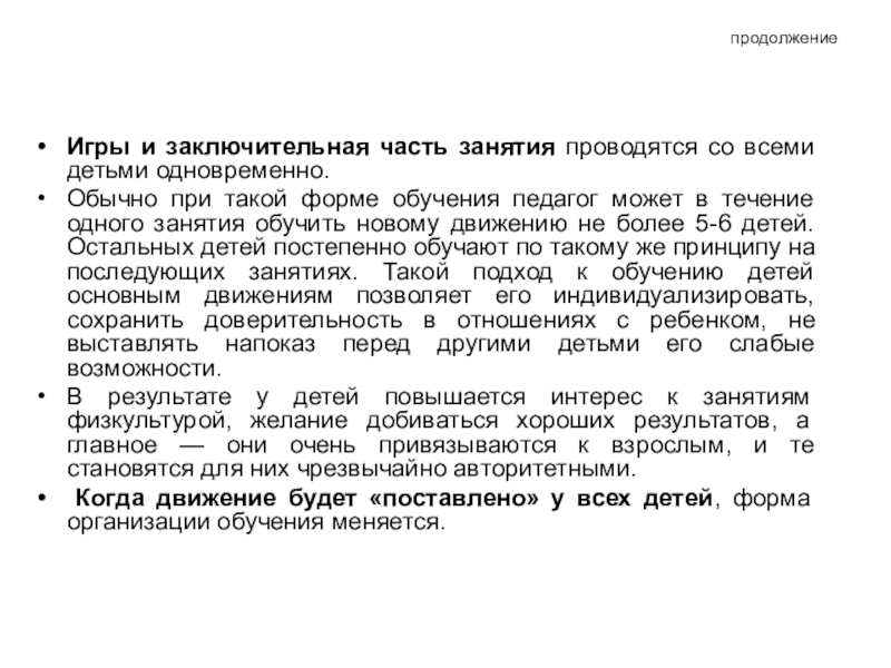при такой форме обучения педагог может в течение одного занятия обучить новому движению не более 5-6 детей. Остальных детей постепенно обучают по такому же принципу на последующих занятиях. Такой подход к обучению детей основным движениям позволяет его индивидуализировать, сохранить доверительность в отношениях с ребенком, не выставлять напоказ перед другими детьми его слабые возможности.