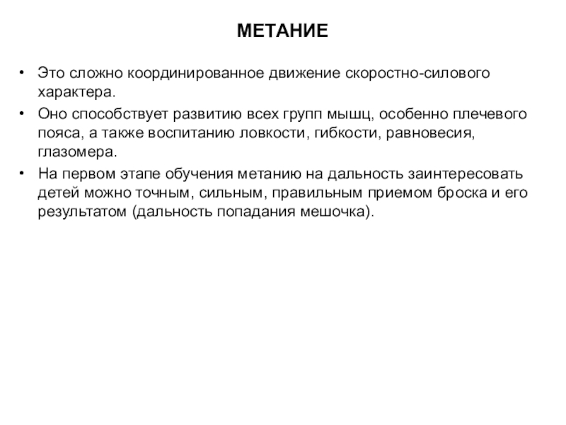 На первом этапе обучения метанию на дальность заинтересовать детей можно точным, сильным, правильным приемом броска и его результатом (дальность попадания мешочка).