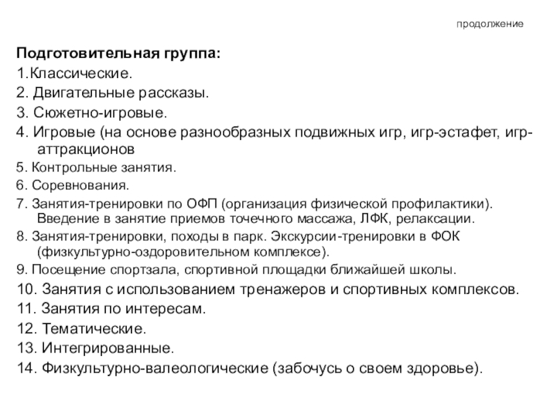 При втором подходе выделяют обучающие, развивающие и оздоровительные занятия.